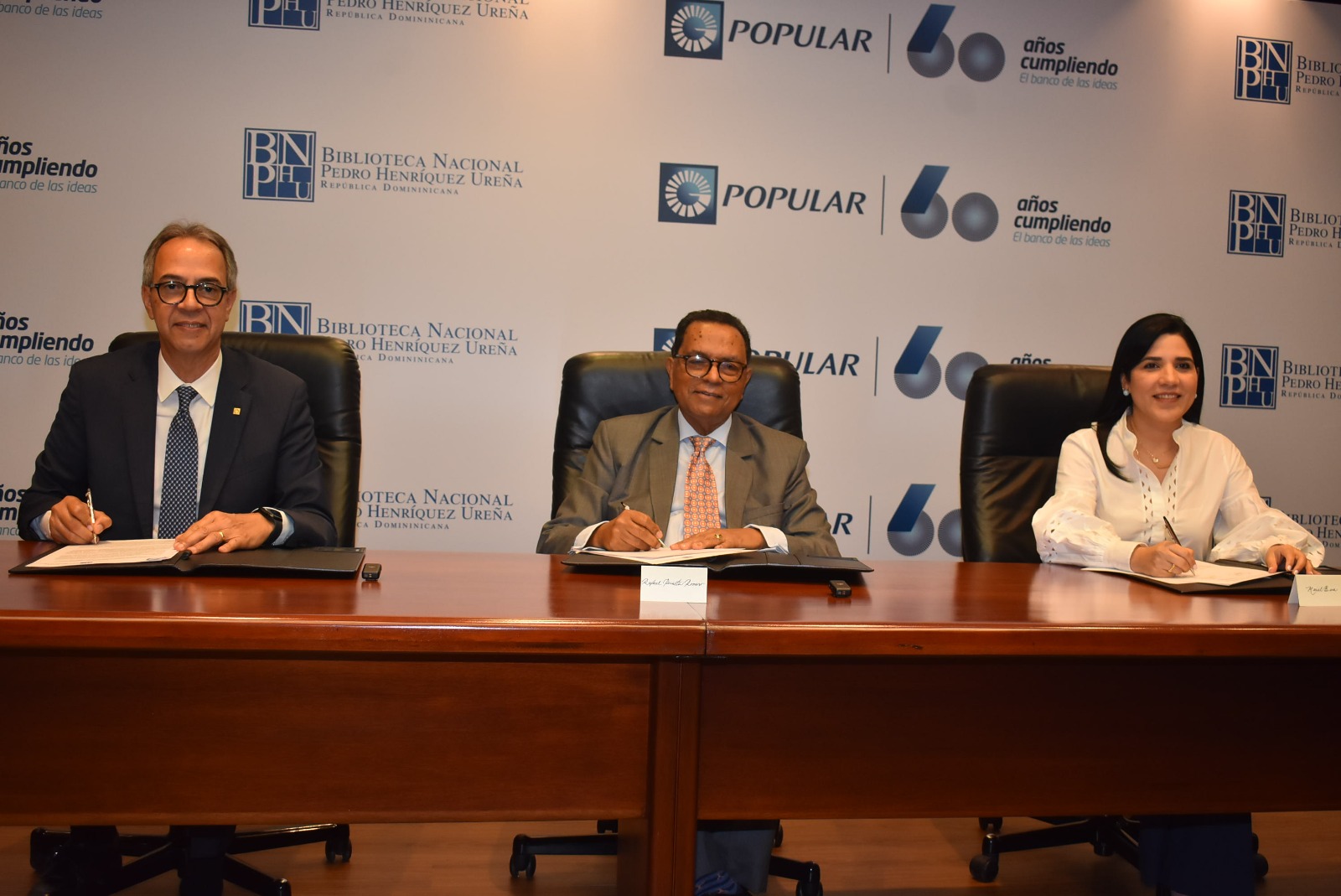 Por el Banco Popular, el convenio fue firmado por José Mármol, vicepresidente Ejecutivo Comunicaciones Corporativas, Reputación y Banca Responsable, y Damaris Mariel Bera Asencio, Vicepresidente Área de Relaciones Corporativas y Banca Responsable. Mientras que por la BNPHU firmó su director general, el escritor y periodista Rafael Peralta Romero, quien agradeció al Banco Popular por el gesto de resplandor financieramente la iniciativa.