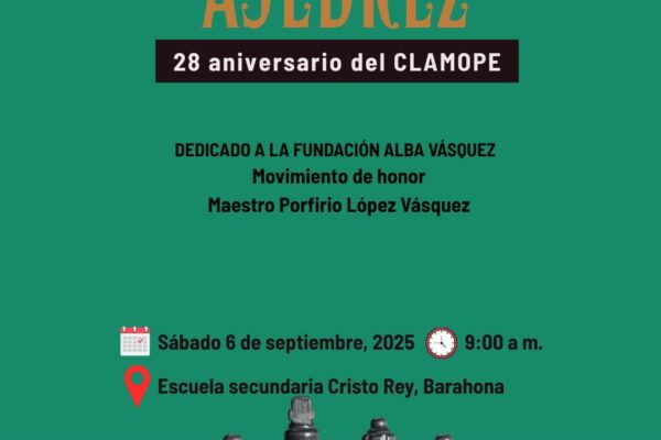 BARAHONA, R.D.— Con el respaldo de la Fundación Alba Vásquez, será celebrado el próximo sábado 6 de septiembre, a partir de las 9:00 de la mañana, en el Liceo Secundario Cristo Rey, el Torneo de Ajedrez por el 28 aniversario del Club de Ajedrez Modesto Peña (CLAMOPE). El director técnico del evento, Fernando Cuevas, ofreció…