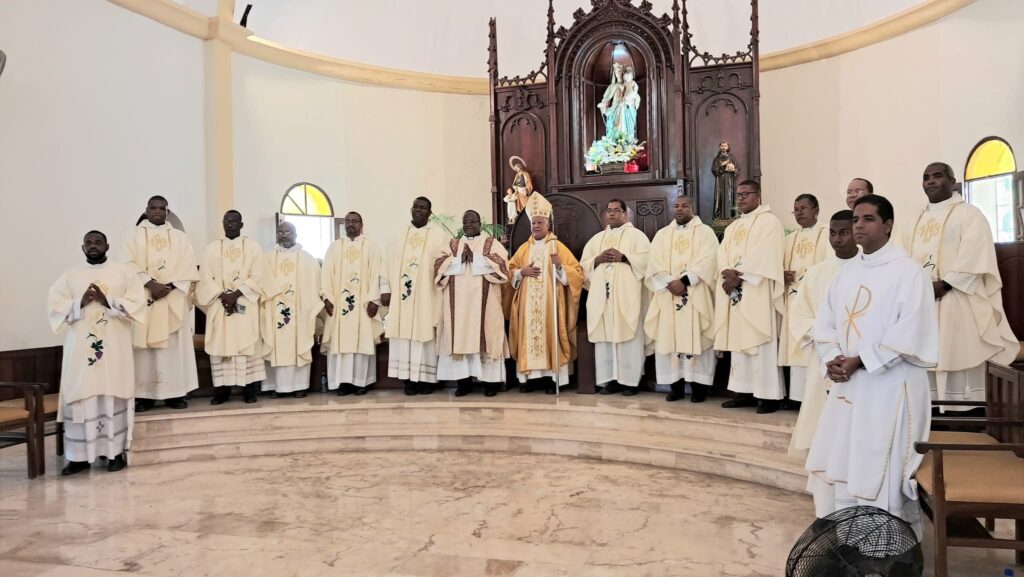 Por imposición de manos y plegaria de Su Excelencia Reverendísima de monseñor Andrés Napoleón Romero Cárdenas, obispo de la diócesis de Barahona, quedó ordenado al diaconado transitorio el seminarista Isvan Osmar Feliz Gómez, en la celebración eucarística del sábado 23 de agosto del 2025, en la Catedral Nuestra Señora del Rosario. Concelebrando monseñor Rafael L. Felipe Núñez, obispo emérito de Barahona, el Rector del seminario Pontificio Santo Tomas de Aquino, y los sacerdotes presentes para la celebración.