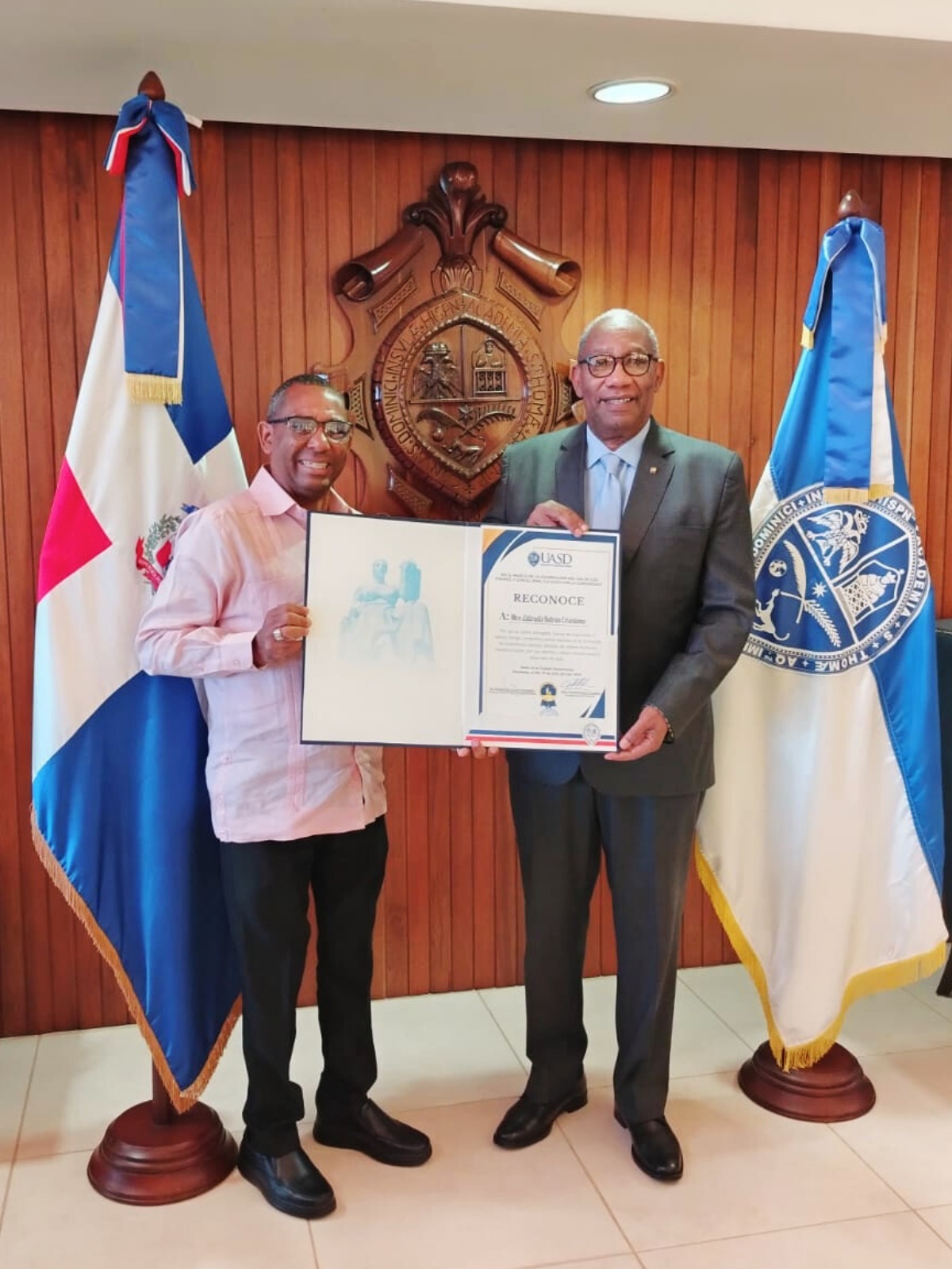 La entrega del reconocimiento la hizo el director general del Recinto UASD Barahona, Maestro Manuel Antonio De La Cruz Fernández, en su despacho de la Rectoría de la más vieja universidad del nuevo mundo.